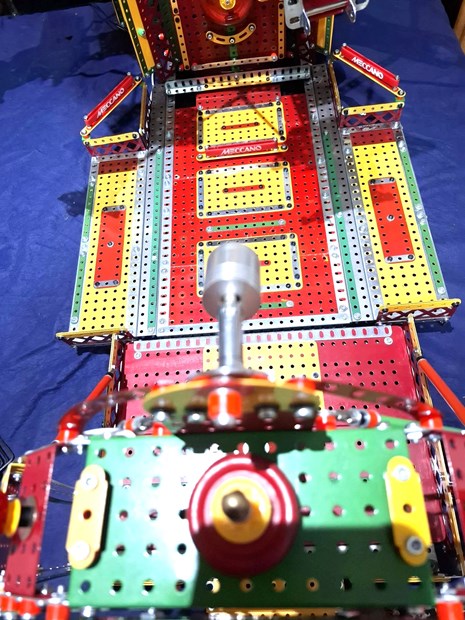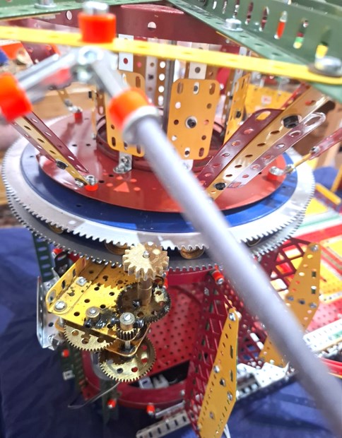 There were of course certain challenges each step of the way but the biggest challenge of all was in finding a motor and gearing system to be fitted to successfully engage a pinion to the large toothed circular double plates seating on top of many flanged wheels to drive its rotation.